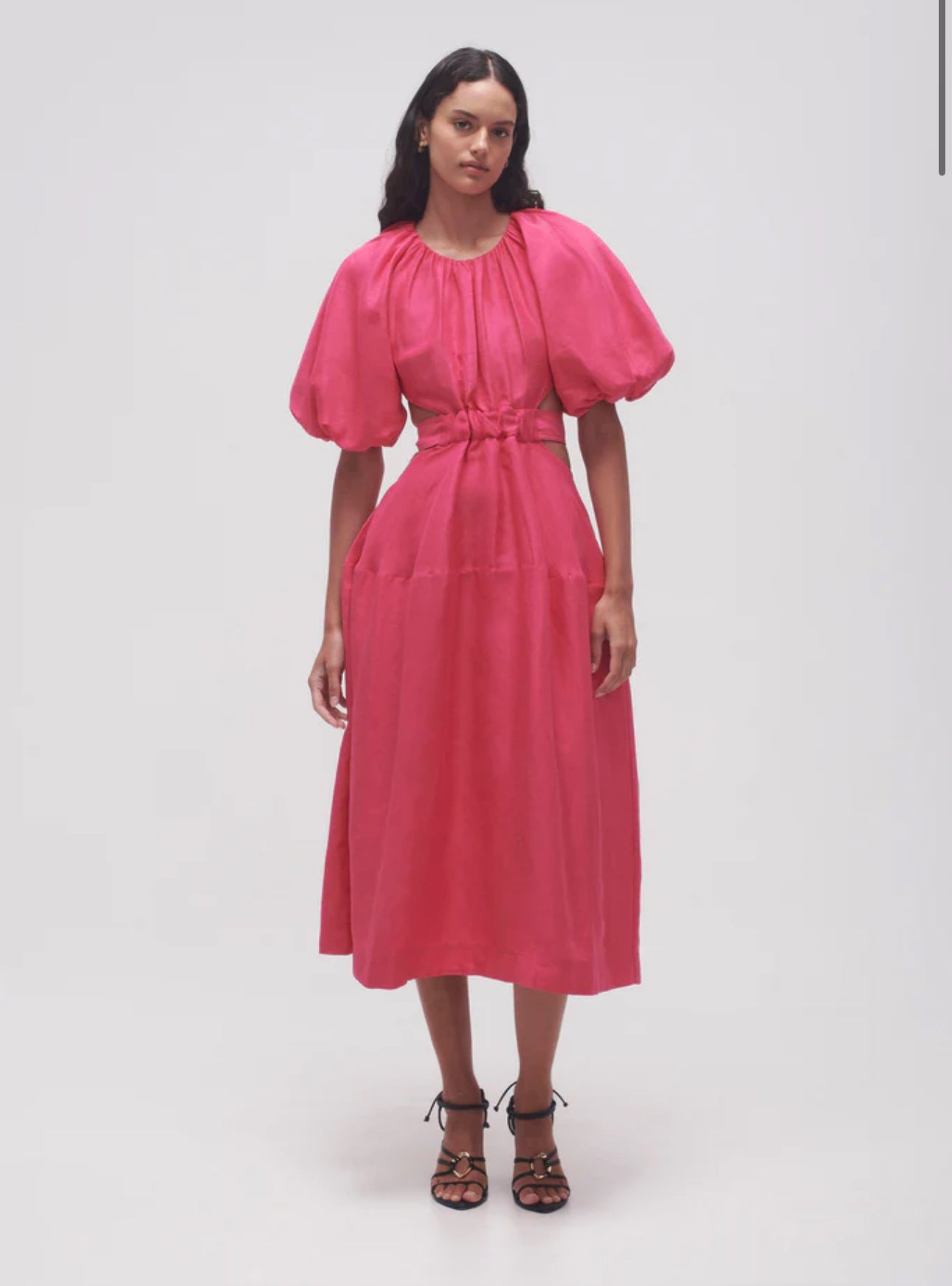 Featuring puff sleeves, a cutout back with bow tie, button detailing and an A-line skirt, it creates a beautiful shape.